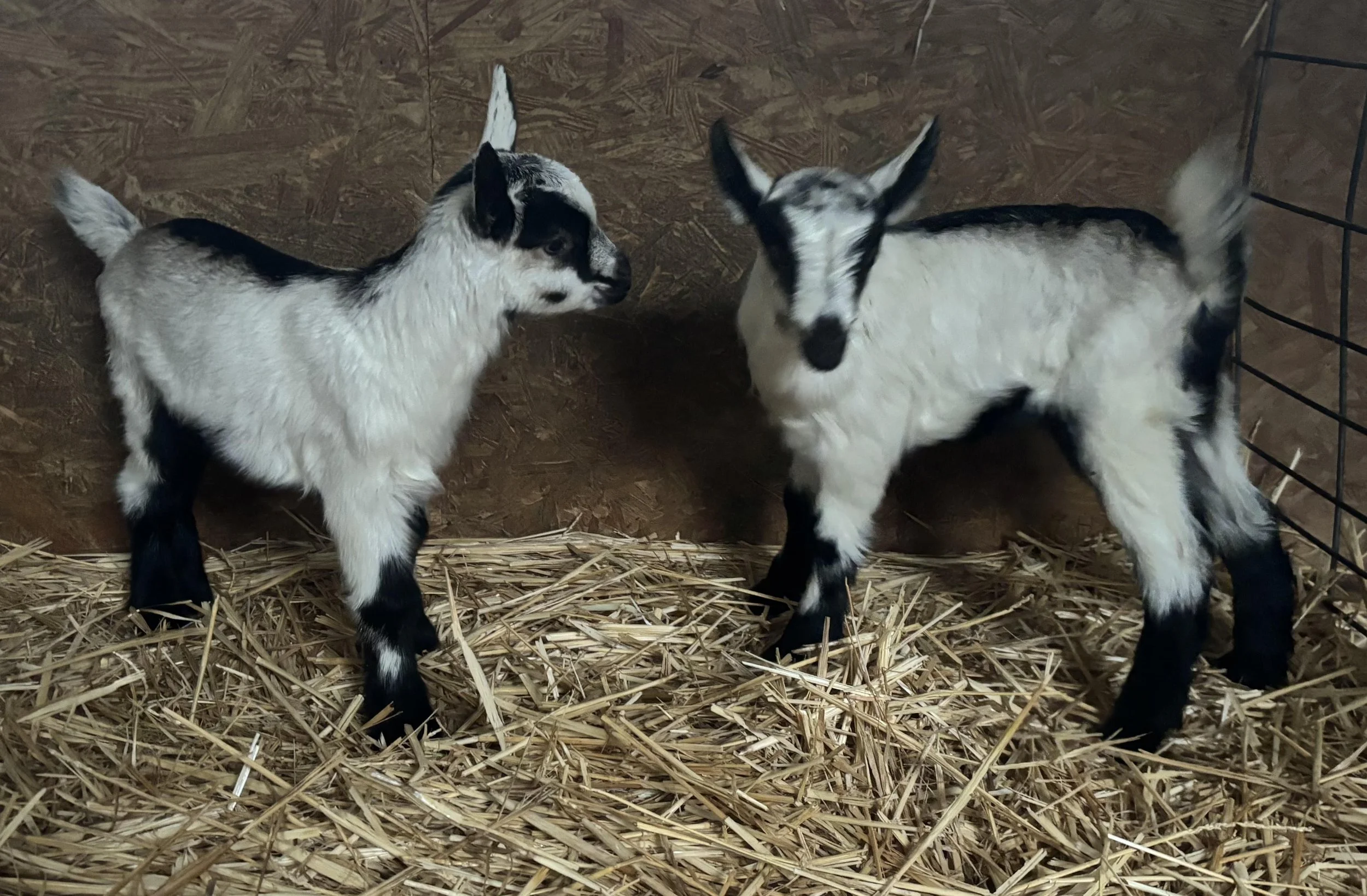 Two buck kids born 2/12/26 are available. They are being bottle-raised with plenty of human interaction and are well socialized.